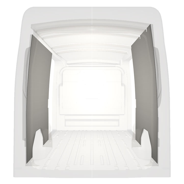 Revêtement entièrement léger pour les parois intérieures d’une Ford Transit avec doubles portes latérales. Les parois créeront un environnement professionnel lumineux et convivial et se nettoient facilement.