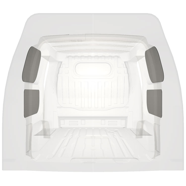 Revêtement léger pré-découpé pour les parois intérieures d’une Nissan NV200 avec doubles portes latérales. Les parois créeront un environnement professionnel lumineux et convivial et se nettoient facilement.