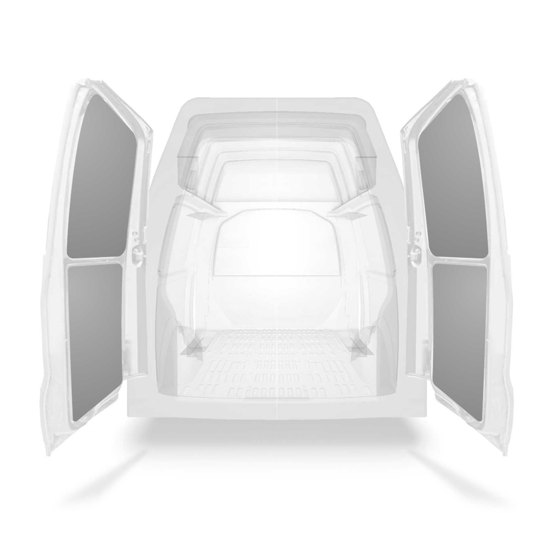 Revêtement de parois léger pour portes arrières d’une Volkswagen Transporter T6 avec doubles portes. Conçus pour offrir une finition professionnelle à l’intérieur, les revêtements de porte préservent l’utilitaire et se nettoient facilement.