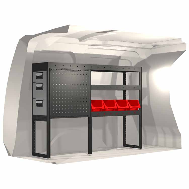 Ce système d’aménagement a été spécialement conçu pour assurer une adaptation optimale ainsi que la meilleure fonctionnalité et sécurité possible. Il a été développé pour un usage professionnel, est flexible et est destiné à des métiers de services dans des domaines variés. Toutes les étagères sont équipées de tapis caoutchouc, et tous les tiroirs de tapis mousse. Les composants d’assemblage et de fixation sont inclus.