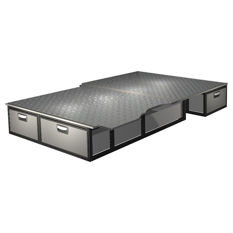 The kit is designed to be fitted on top of a Modul-Floor, utilizing the floor rails for a non-intrusive installation. The double floor is equipped with rails for easy installation of vehicle racking, and edging strips for a nice finish.