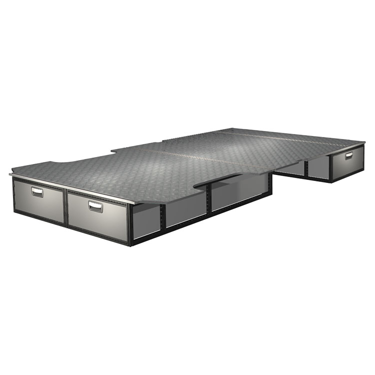 The kit is designed to be fitted on top of a Modul-Floor, utilizing the floor rails for a non-intrusive installation. The double floor is equipped with rails for easy installation of vehicle racking, and edging strips for a nice finish.