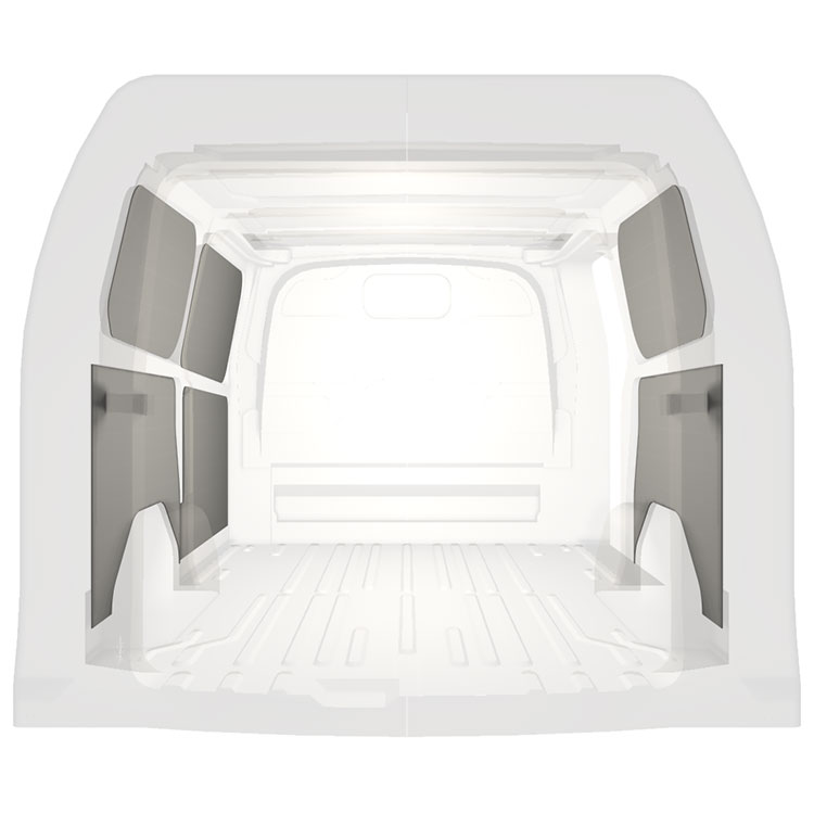 Revêtement de parois léger pour parois intérieures d’une Ford Transit Custom avec une porte latérale à droite. Les parois créeront un environnement professionnel lumineux et convivial et se nettoient facilement.