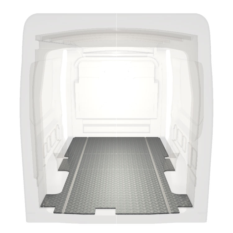 Plancher standard ultra-léger et robuste pour une Ford Transit avec une plaque de roulement en aluminium antidérapant et des rails de chargement (longitudinaux) pour une installation rapide et sûre des systèmes de rayonnage et autres accessoires.