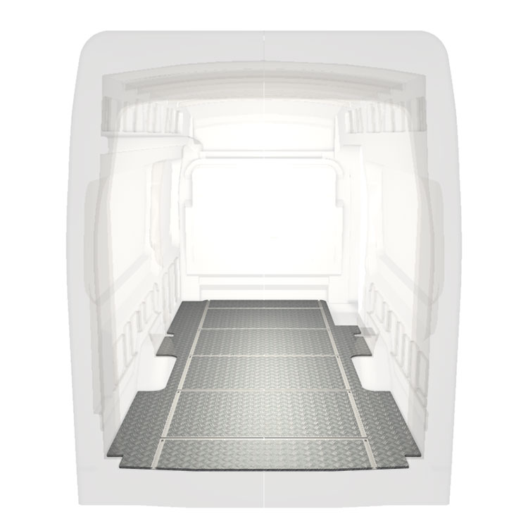 Plancher léger et robuste avec rails transversaux pour une Ford Transit avec une plaque de roulement en aluminium antidérapant et des rails de chargement (longitudinaux et transversaux) pour une installation rapide et sûre des systèmes de rayonnage et autres accessoires.