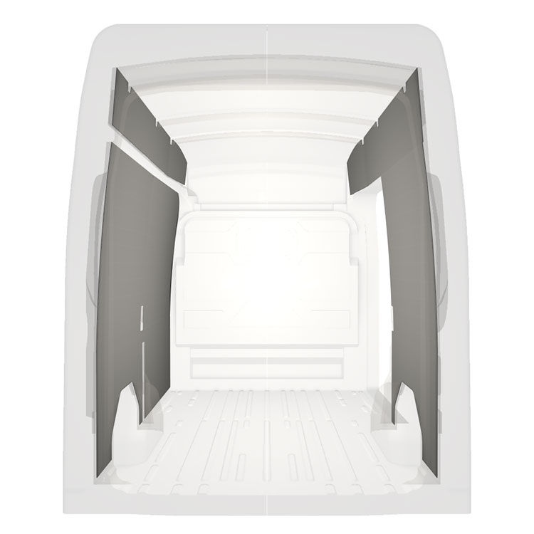 Revêtement entièrement léger pour parois intérieures d’une Ford Transit avec une porte latérale à droite. Les revêtements créent un environnement professionnel lumineux et convivial et se nettoient facilement.
