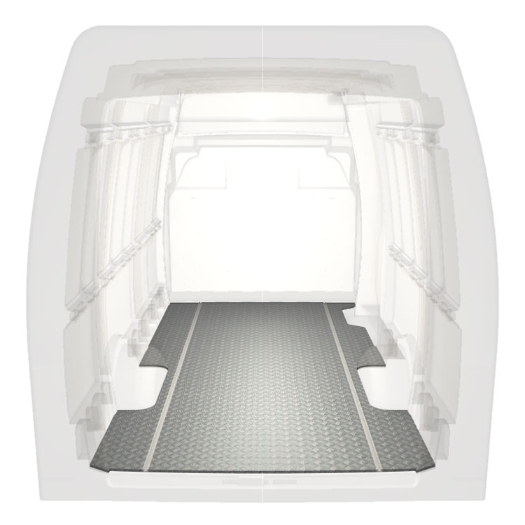 Plancher très long léger et robuste pour une Iveco Daily avec une plaque de roulement en aluminium antidérapant et des rails de chargement (longitudinaux) pour une installation rapide et sûre des systèmes de rayonnage et autres accessoires.