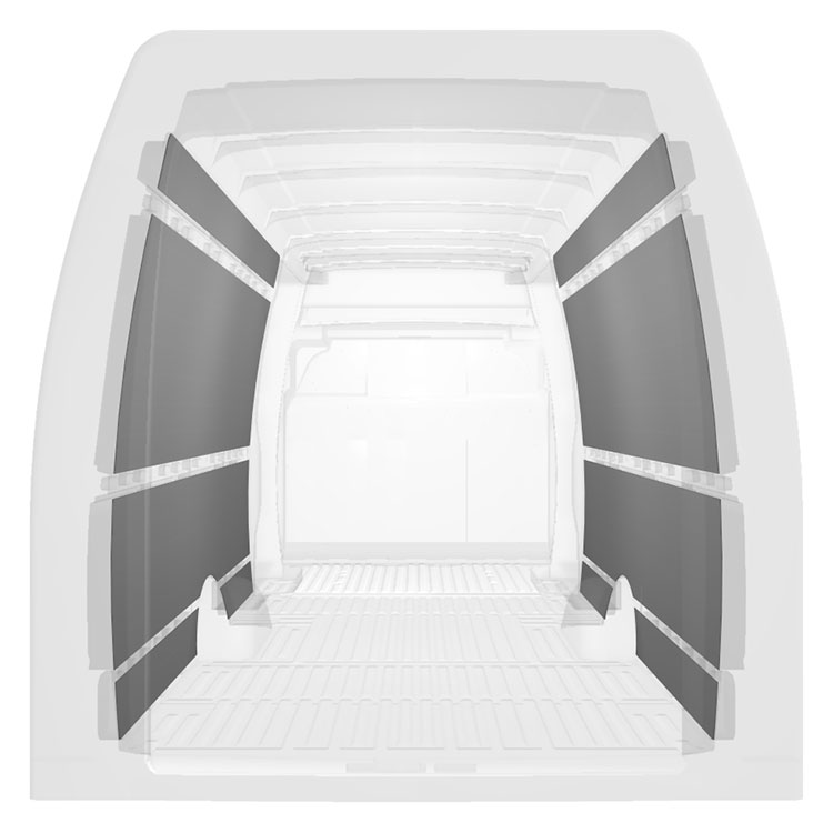 Revêtement léger pré-découpé pour les parois intérieures d’une Iveco Daily avec doubles portes latérales. Les parois créeront un environnement professionnel lumineux et convivial et se nettoient facilement.