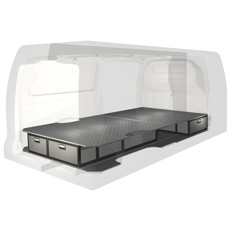 The kit is designed to be fitted on top of a Modul-Floor, utilizing the floor rails for a non-intrusive installation. The double floor is equipped with rails for easy installation of vehicle racking, and edging strips for a nice finish.