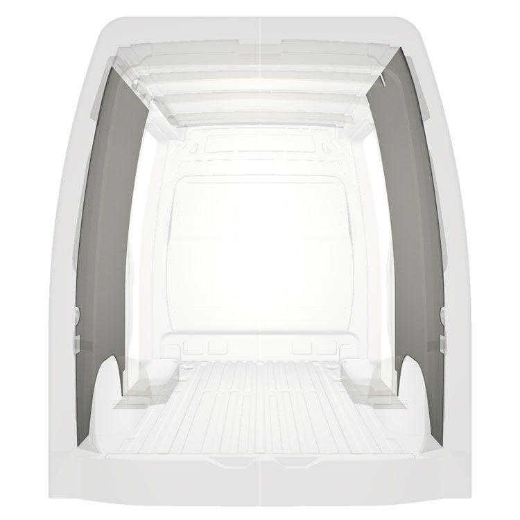 Revêtement entièrement léger pour les parois intérieures d’une Mercedes Sprinter avec doubles portes latérales. Les parois créeront un environnement professionnel lumineux et convivial et se nettoient facilement.