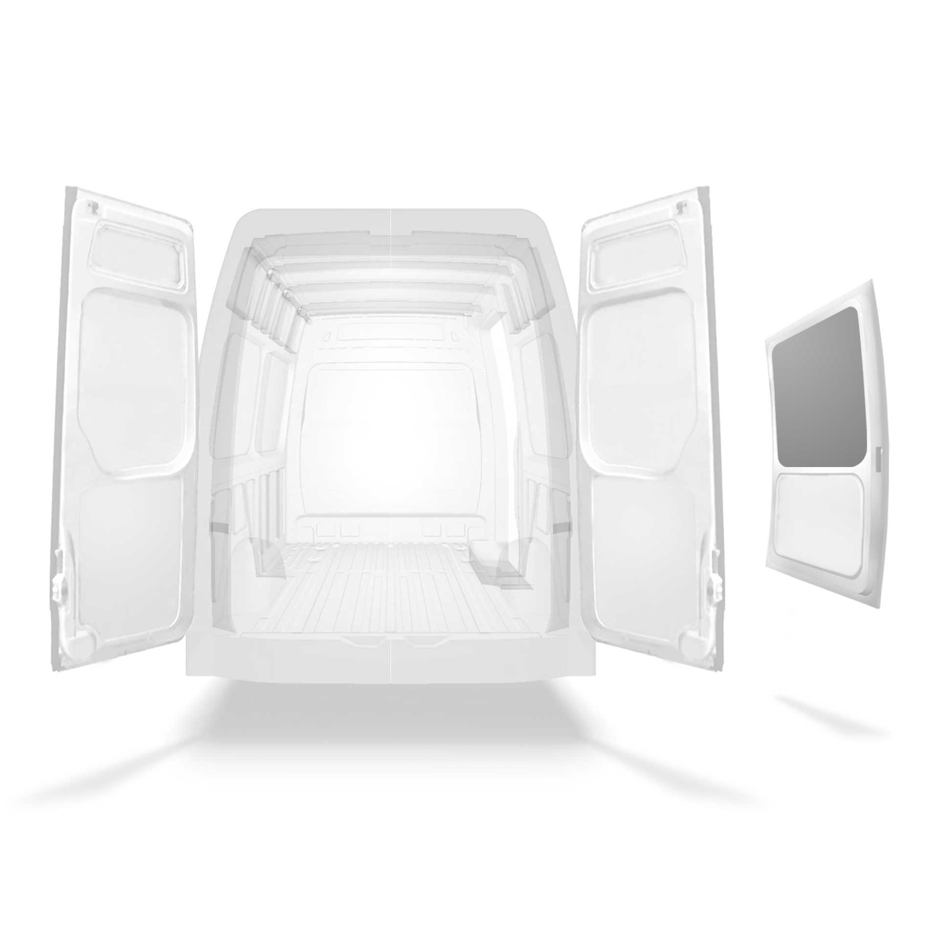 Revêtement léger pour la partie supérieure de la porte latérale d’une Mercedes Sprinter avec une porte latérale à droite. Le revêtement réduira l’usure normale à l'intérieur et contribuera à maintenir la valeur résiduelle de l’utilitaire.