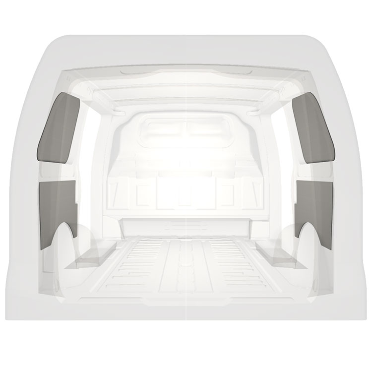 Revêtement léger pré-découpé pour les parois intérieures d’une Mercedes Vito avec doubles portes latérales. Les parois créeront un environnement professionnel lumineux et convivial et se nettoient facilement.