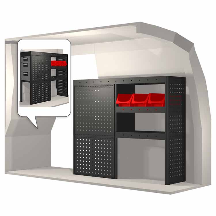 Ce système d’aménagement a été spécialement conçu pour assurer une adaptation optimale ainsi que la meilleure fonctionnalité et sécurité possible. Il a été développé pour un usage professionnel, est flexible et est destiné à des métiers de services dans des domaines variés. Toutes les étagères sont équipées de tapis caoutchouc, et tous les tiroirs de tapis mousse. Les composants d’assemblage et de fixation sont inclus.