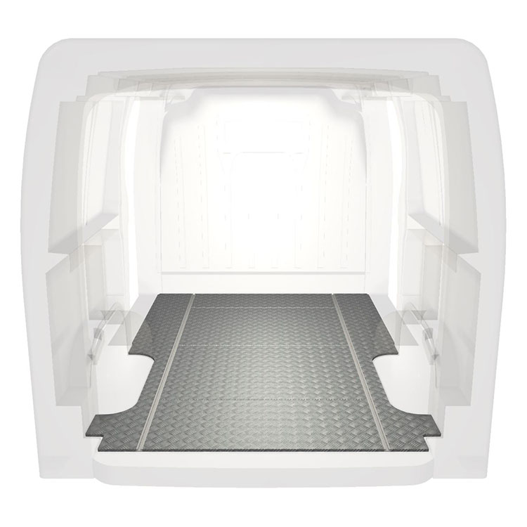 Plancher standard ultra-léger et robuste pour une Renault Master / Opel Movano / Nissan NV400 avec une plaque de roulement en aluminium antidérapant et des rails de chargement (longitudinaux) pour une installation rapide et sûre des systèmes de rayonnage et autres accessoires.