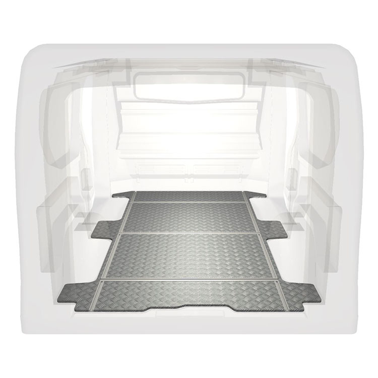 Plancher léger et robuste avec rails transversaux pour une Renault Trafic / Opel Vivaro / Fiat Talento / Nissan NV300 avec une plaque de roulement en aluminium antidérapant et des rails de chargement (longitudinaux et transversaux) pour une installation rapide et sûre des systèmes de rayonnage et autres accessoires.