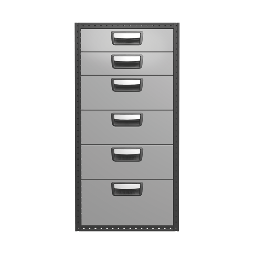 Chaque tiroir est équipé en version standard de glissières sur roulements à billes et sa charge maximale est de 30 kg, tandis que la charge totale par bloc est de 100 kg. Les tiroirs peuvent être ouverts à fond et sont équipés d'arrêtoirs. Pour une utilité maximum, le bloc-tiroirs peut être équipé d'accessoires tels que fond en mousse, séparations et casiers en plastique. Afin d'optimiser le poids, des tôles de fermeture acier et des panoplies sont disponibles en option.