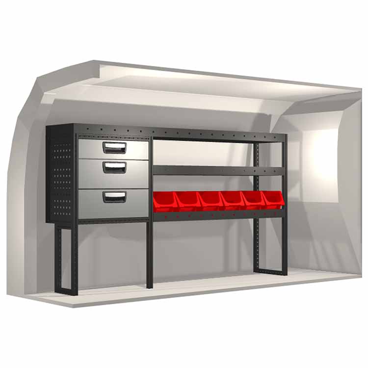 Ce système d’aménagement a été spécialement conçu pour assurer une adaptation optimale ainsi que la meilleure fonctionnalité et sécurité possible. Il a été développé pour un usage professionnel, est flexible et est destiné à des métiers de services dans des domaines variés. Toutes les étagères sont équipées de tapis caoutchouc, et tous les tiroirs de tapis mousse. Les composants d’assemblage et de fixation sont inclus.