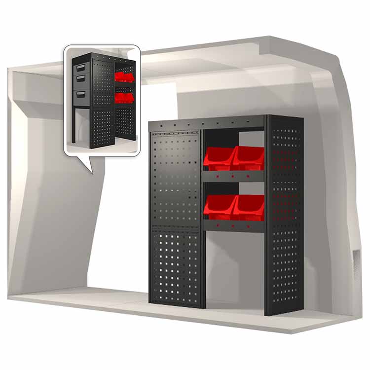 Ce système d’aménagement a été spécialement conçu pour assurer une adaptation optimale ainsi que la meilleure fonctionnalité et sécurité possible. Il a été développé pour un usage professionnel, est flexible et est destiné à des métiers de services dans des domaines variés. Toutes les étagères sont équipées de tapis caoutchouc, et tous les tiroirs de tapis mousse. Les composants d’assemblage et de fixation sont inclus.