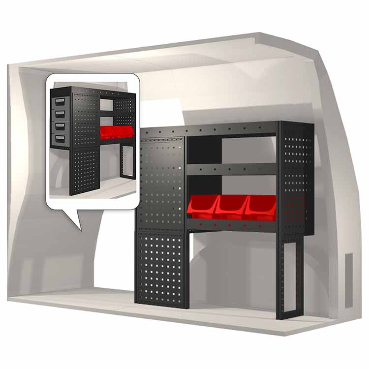 Ce système d’aménagement a été spécialement conçu pour assurer une adaptation optimale ainsi que la meilleure fonctionnalité et sécurité possible. Il a été développé pour un usage professionnel, est flexible et est destiné à des métiers de services dans des domaines variés. Toutes les étagères sont équipées de tapis caoutchouc, et tous les tiroirs de tapis mousse. Les composants d’assemblage et de fixation sont inclus.