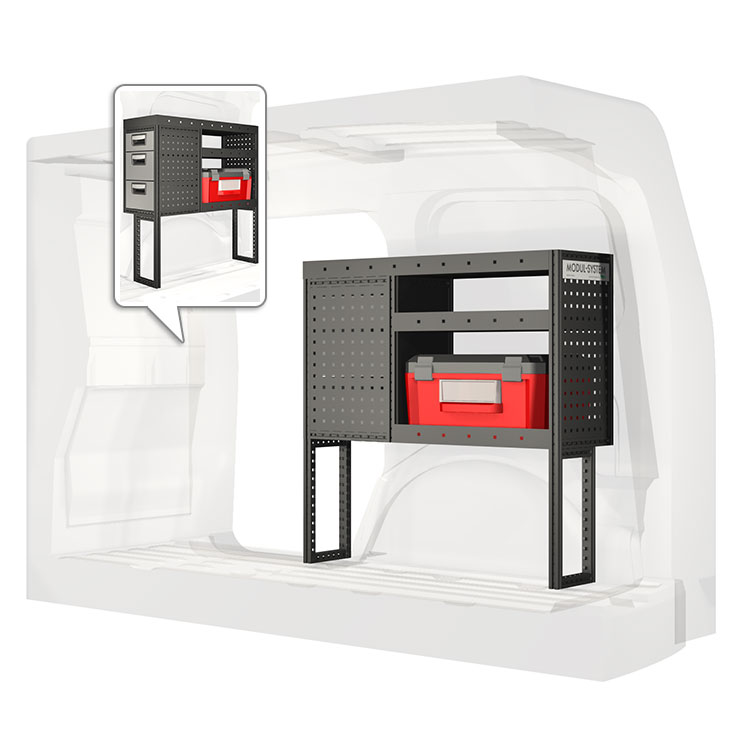 Ce système d’aménagement a été spécialement conçu pour assurer une adaptation optimale ainsi que la meilleure fonctionnalité et sécurité possible. Il a été développé pour un usage professionnel, est flexible et est destiné à des métiers de services dans des domaines variés. Toutes les étagères sont équipées de tapis caoutchouc, et tous les tiroirs de tapis mousse. Les composants d’assemblage et de fixation sont inclus.