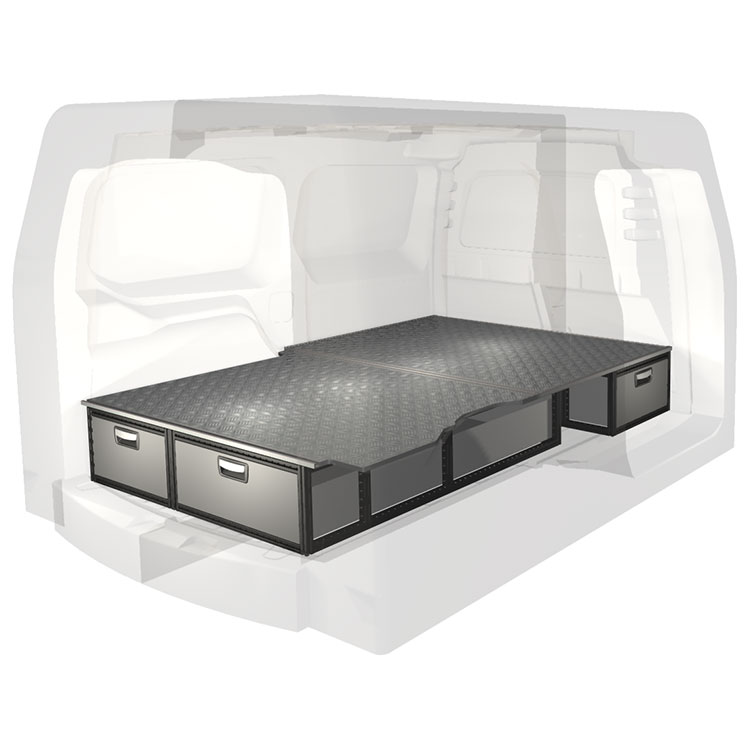 The kit is designed to be fitted on top of a wooden floor. The double floor is equipped with rails for easy installation of vehicle racking, and edging strips for a nice finish.